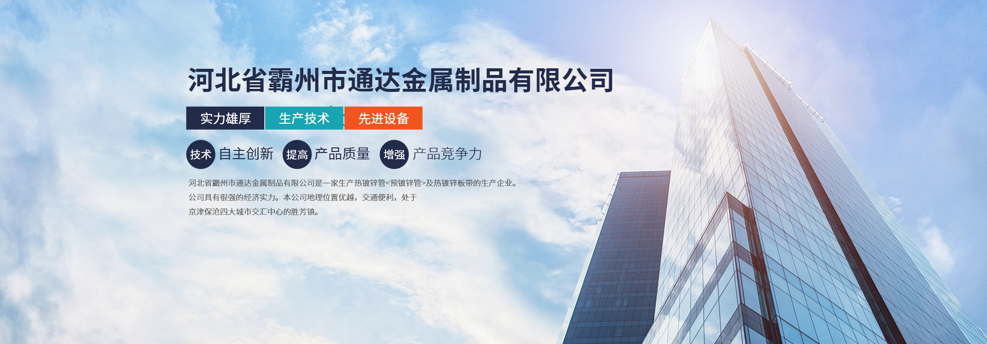 • 河北省霸州市通達金屬制品有限公司是一家生產熱鍍鋅管<預鍍鋅管>及熱鍍鋅板帶的生產企業。公司具有很強的經濟實力。本 公司地理位置優越,交通便利,處于京津保滄四大城市交匯中心的勝芳鎮。由于公司不斷發展壯大,良好的投資環境為我公司的發展提供了可靠的保障。本公司是河北省重合同守信用企業,被評為AAA級信用企業